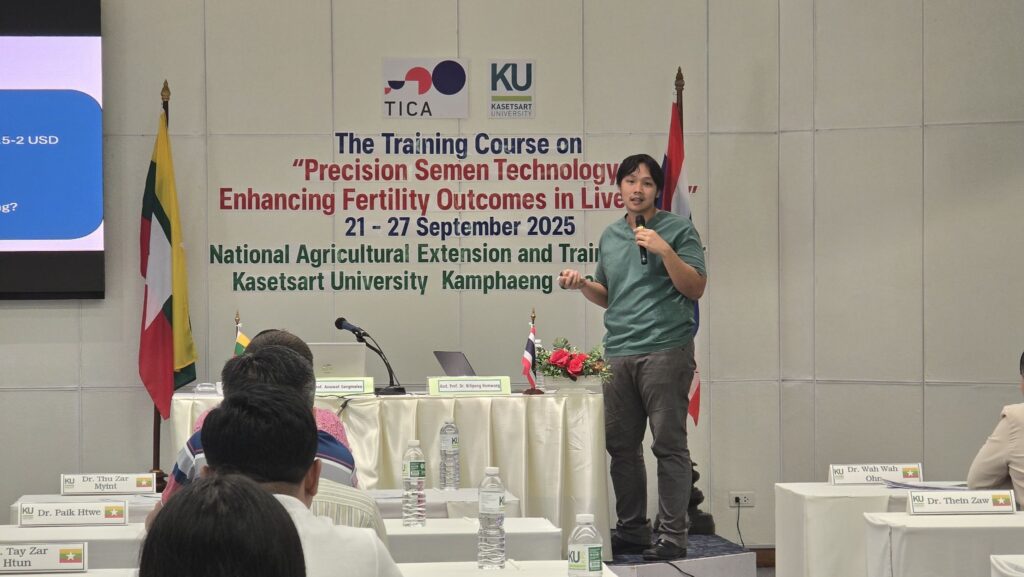 On September 24 2025, the 4th day of the international training program on “Precision Semen Technology: Enhancing Fertility Outcomes in Livestock”, is another intensive and practical session for the participants. In the morning, they had a workshop on “Semen Evaluation and Cryopreservation” facilitated by Assoc. Prof. Anawat Saengmalee, DVM; and Dr. Suphawit Triwutthanon, DVM; Lecturers from the Faculty of Veterinary Medicine, at Laboratory 2, Faculty of Veterinary Medicine, Kasetsart University Kamphaeng Saen Campus. In the afternoon, the trainees attended lectures and discussion on the “Challenges in Semen Cryopreservation: Basic Principles and Advanced Solutions, Comparing Fresh, Chilled, and Frozen-Thawed Semen in Livestock Breeding, Cutting-Edge Semen Production and Sexed Semen Technology, and Market Insights: Success Stories and Challenges.” The session were delivered by Assoc. Prof. Anawat Saengmalee, DVM; Suphawit Triwutthanon, DVM, Ph.D.; Janchao Lorthongpanich, Ph.D.; and Chuti Laothamathorn, Ph.D., at the Queen Palm Room, National Agricultural Extension and Training Center, Kasetsart University Kamphaeng Saen Campus.
