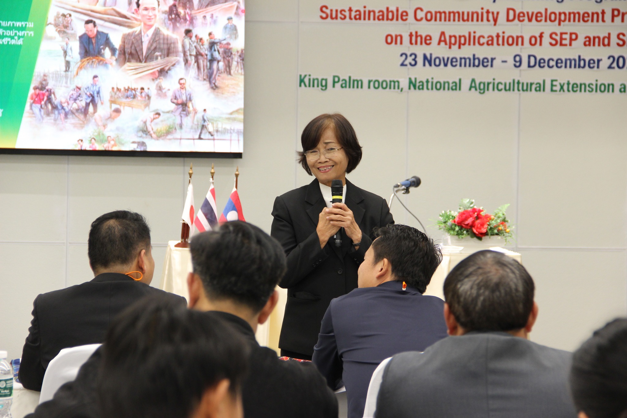 ໃນພາກບ່າຍ ໄດ້ມີການຝຶກອົບຮົມຫົວຂໍ້ “ແນວຄິດແລະຫຼັກການຂອງປັດຍາເສດຖະກິດພໍເພຽງ (Sufficiency Economy Philosophy) 3 ຫ່ວງ 2 ເງື່ອນໄຂ” ໂດຍໄດ້ຮັບກຽດຈາກ ດຣ. ອຸສາ ເທຽນທອງ ເປັນຜູ້ບັນຍາຍ ຈັດຂຶ້ນທີ່ ຫ້ອງ King’s Palm ອາຄານຝຶກອົບຮົມ ສູນສົ່ງເສີມແລະຝຶກການເກສະກຳແຫ່ງຊາດ.