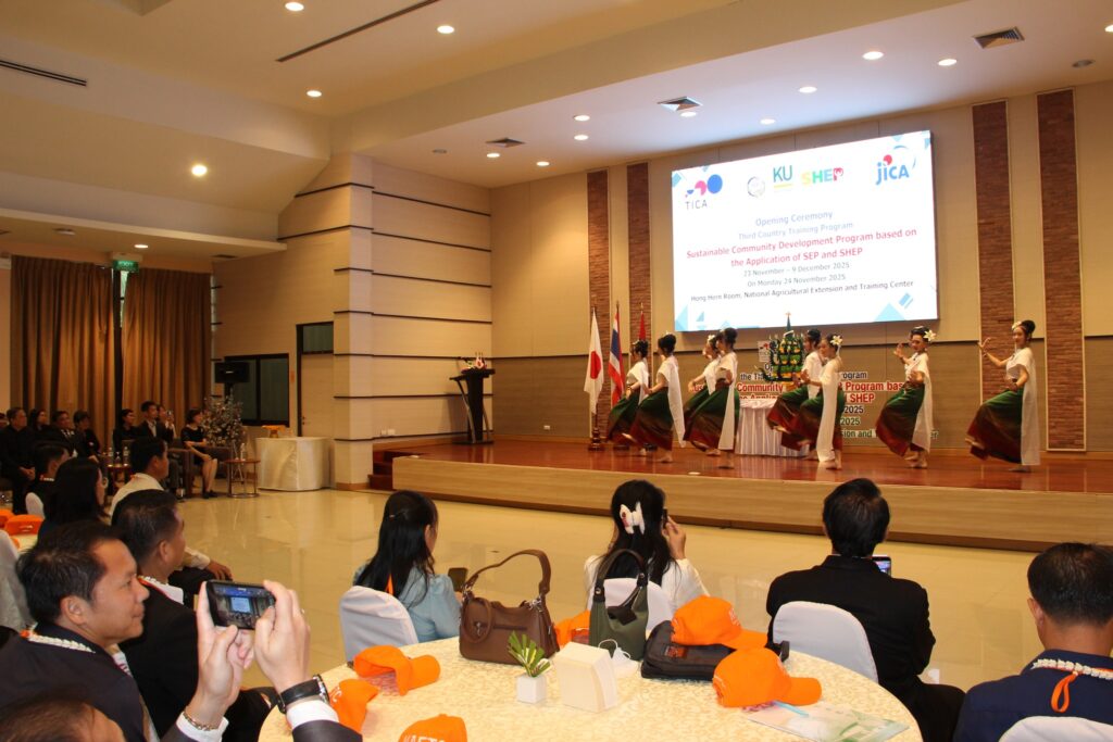 The Office of Extension and Training Kamphaeng Saen (OET.KPS.), in collaboration with the Thailand International Cooperation Agency (TICA) and the Japan International Cooperation Agency (JICA), organized the training program “Sustainable Community Development Program based on the Application of SEP and SHEP” from 23 November to 9 December 2025. The program is provided for 18 agricultural extension officers from the Lao People’s Democratic Republic and 2 agricultural extension officers from Thailand at the King’s Palm Room, Training Building, National Agricultural Extension and Training Center.. The objective of the program is to enhance participants’ capacity and strengthen their knowledge in sustainable community development based on the principles of SEP and SHEP, thereby contributing to the long-term improvement of farmers’ quality of life in their respective areas.