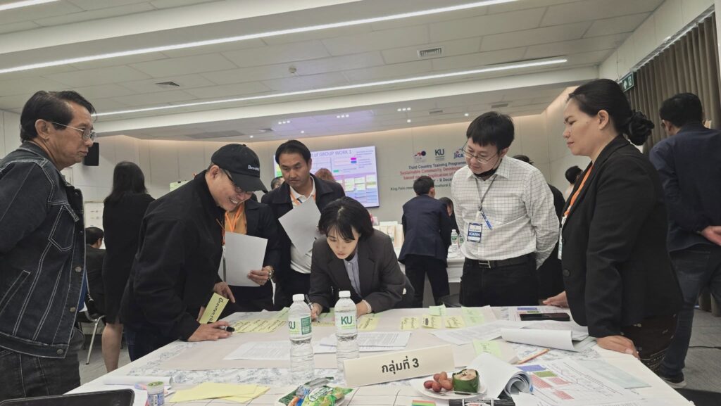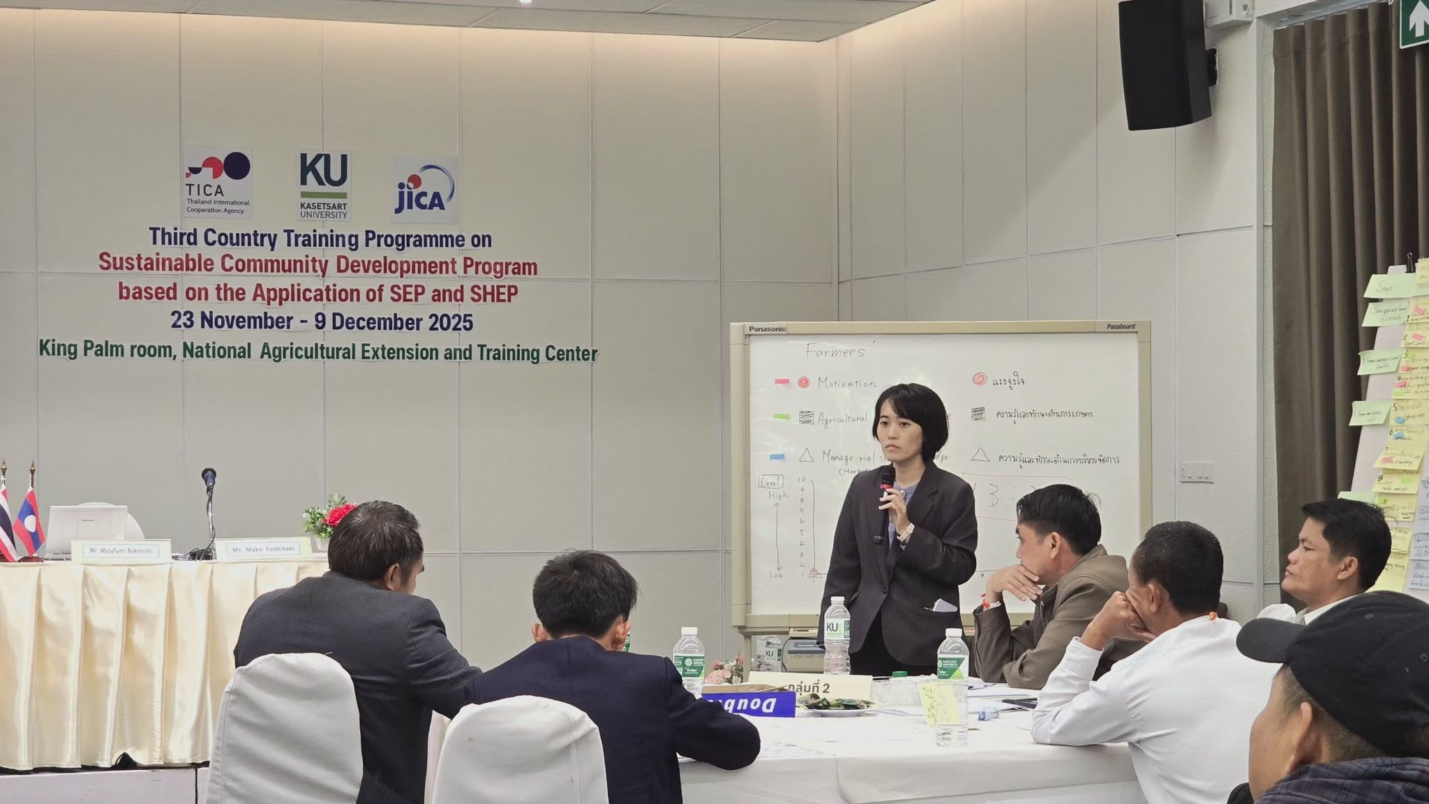 The Office of Extension and Training Kamphaeng Saen (OET.KPS.) conducted the training course “Sustainable Community Development Program based on the Application of SEP and SHEP” from 23 November to 9 December 2025, for 18 agricultural extension officers from the Lao People’s Democratic Republic and 2 participants from Thailand. On 2 December 2025, a full-day training session was held on the topic “SHEP Workshop 2”, focusing on production planning using market-oriented information. The session emphasized how farmers can produce according to market needs—covering product type, quantity, quality, and timing. The workshop was honored to have Mr. Masafumi Nakanishi and Ms. Mako Yoshitani as lecturers, sharing valuable insights and experiences from the SHEP approach to support participants in applying the knowledge in real-world settings. The training took place at the King Palm Room, Training Building, National Agricultural Extension and Training Center.