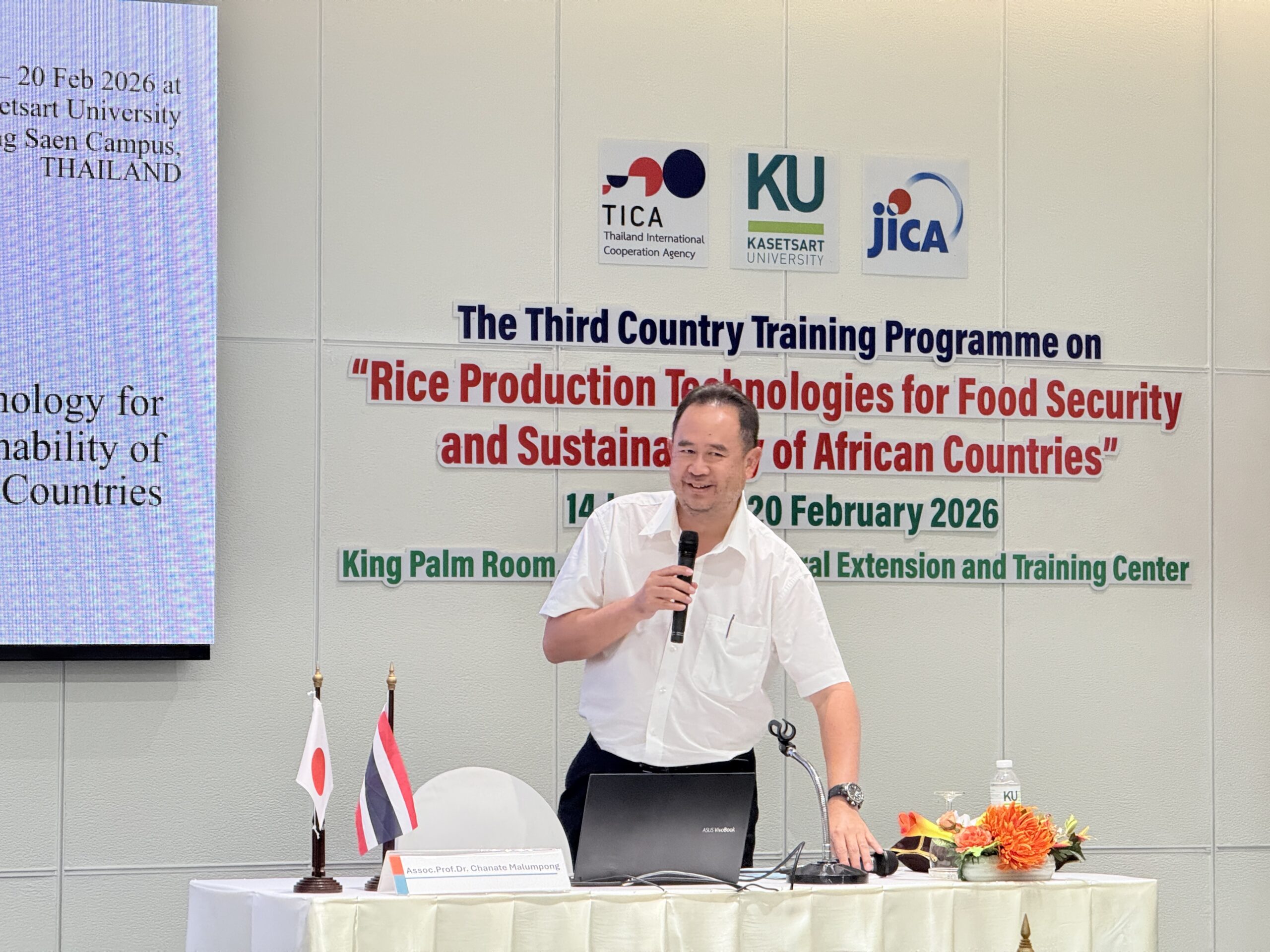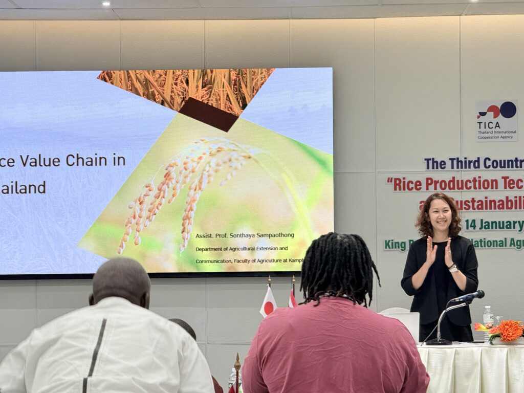 The Office of Extension and Training Kamphaeng Saen (OET.KPS.), Kasetsart University, in collaboration with the Japan International Cooperation Agency (JICA) and the Thailand International Cooperation Agency (TICA), has once again launched an international training program under the course ‘Rice Production Technologies for Food Security and Sustainability of African Countries 2026,’ held from 14 January to 20 February 2026 at the Kings Palm Room, Training Building, National Agricultural Extension and Training Center. The program aims to strengthen Thailand–Africa relations while transferring advanced rice production technologies to promote sustainable global food security.
