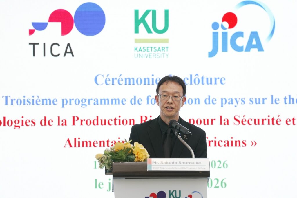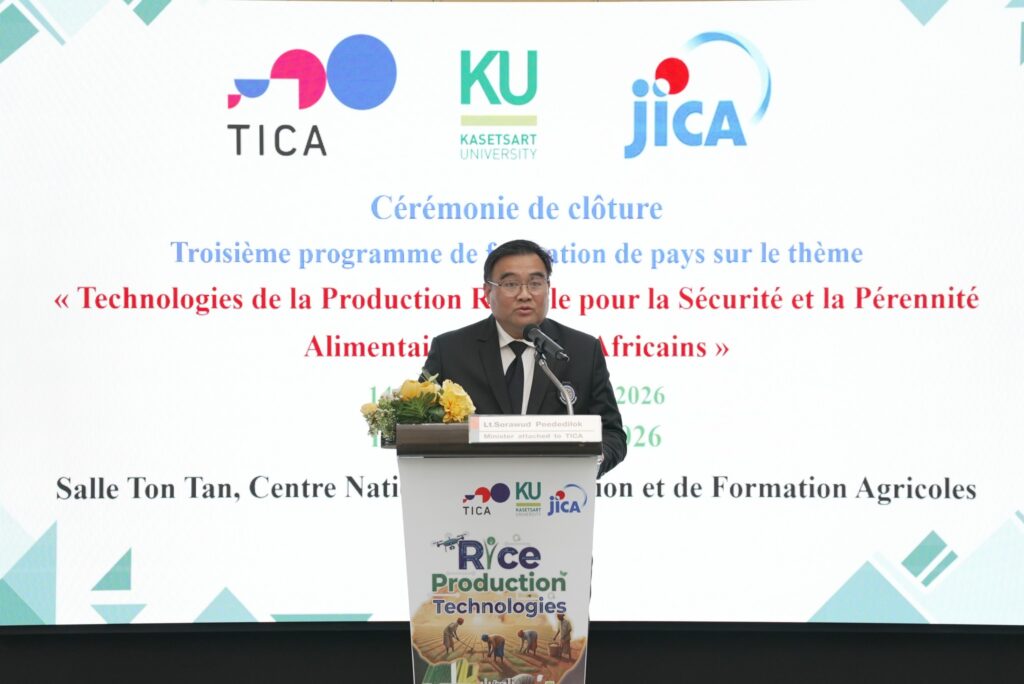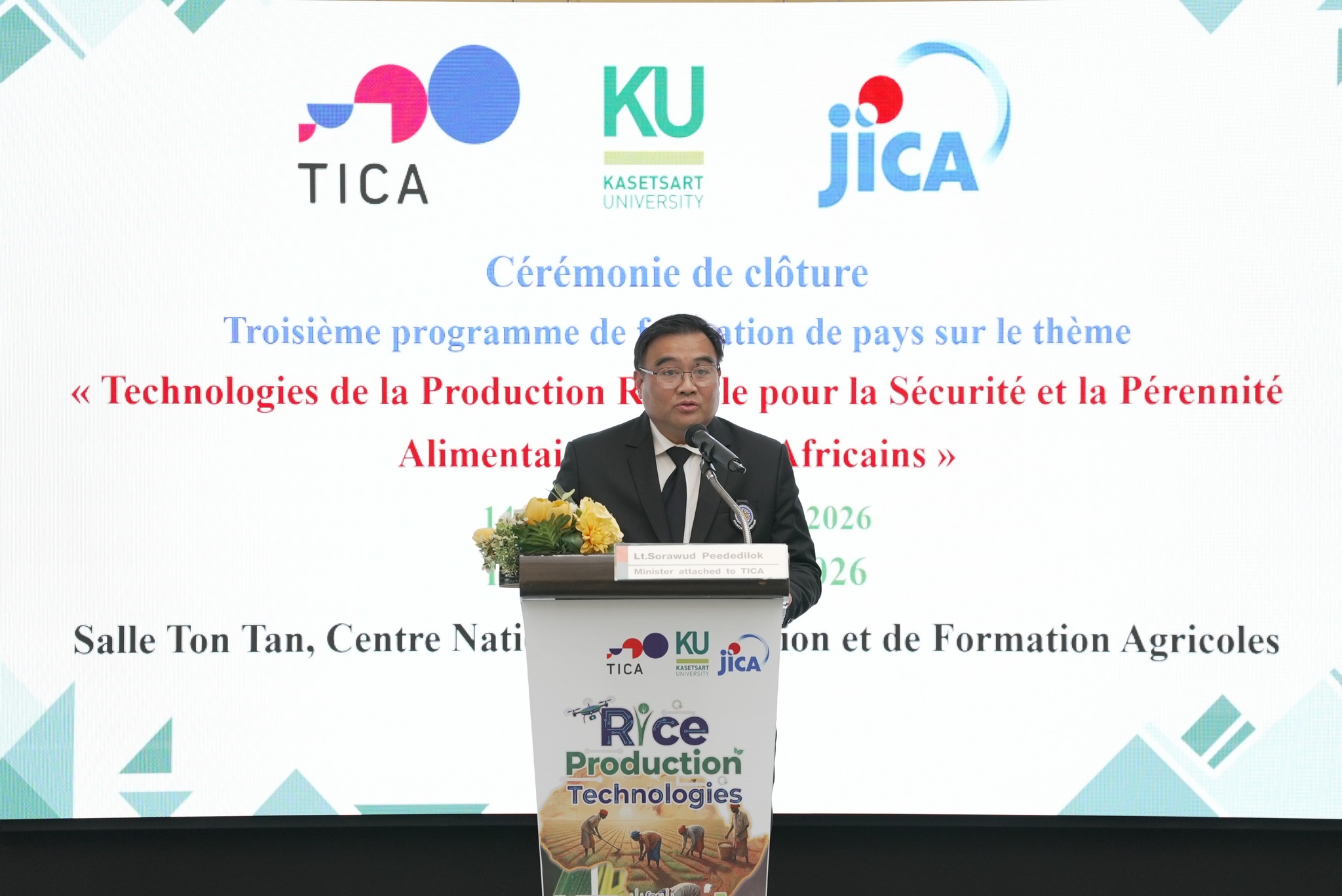On February 19, 2026, the Office of Extension and Training, Kamphaeng Saen (OETKPS), Kasetsart University, in collaboration with the Thailand International Cooperation Agency (TICA) and the Japan International Cooperation Agency (JICA), officially hosted the closing ceremony for the international training program “Rice Production Technologies for Food Security and Sustainability of African Countries 2026” at the Hong Hern Room. This initiative, serving as a testament to Thai-Japanese development cooperation, was designed to build capacity in advanced rice production technologies for African nations. The ceremony was presided over by Asst. Prof. Dr. Sukanya Rattanatabtimtong, Assistant to the President for Research, Academic Services, and International Relations at KU Kamphaeng Saen Campus, with a comprehensive summary report delivered by Dr. Kanyarat Chiewwech, Director of the Office of Extension and Training. The event was further distinguished by congratulatory remarks from Mr. SAKUDO Shunsuke, Chief Representative of the JICA Thailand Office, and First Lieutenant Sorawud Preededilok, Minister at the Royal Thai Embassy in Helsinki, on duty at TICA. Representing the delegates, Mr. Ouannougo Soro delivered a heartfelt reflection on the knowledge and experiences gained, followed by an inspiring recap video and group photography that cemented the strong bonds between Thailand and the African continent. Leveraging its extensive expertise in comprehensive agricultural training, the Office of Extension and Training remains steadfast in its commitment to serving as a global learning hub, continually advancing Thai agricultural knowledge to foster sustainability within the international community.